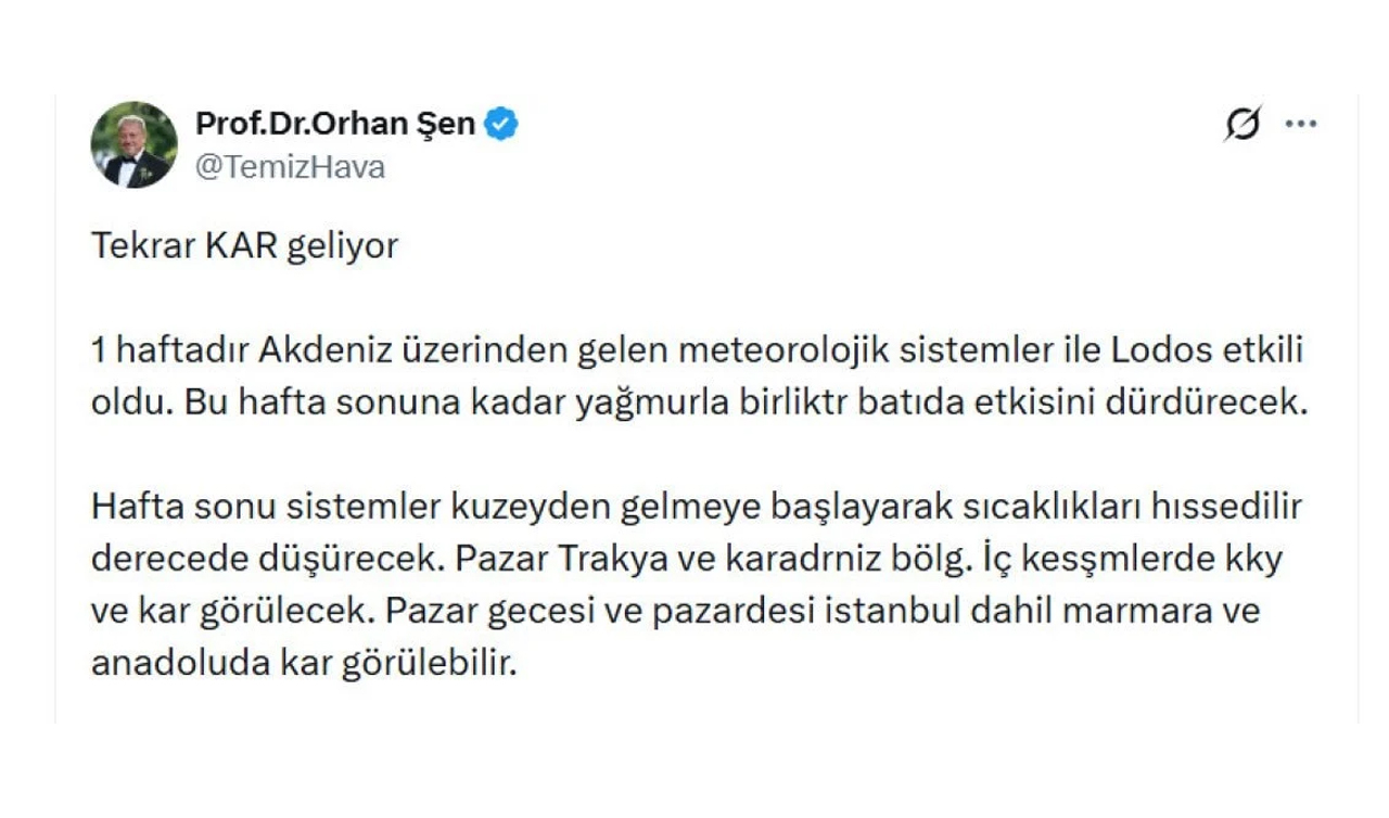 Hafta sonu kuzeyden gelecek sistemle birlikte hava sıcaklıklarının hissedilir derecede düşeceğini ifade eden Şen, Pazar günü Trakya ve Karadeniz bölgesinin iç kesimlerinde karla karışık yağmur ve kar yağışının görüleceğini bildirdi.Açıklaması ise şu şekilde: "Tekrar KAR geliyor 1 haftadır Akdeniz üzerinden gelen meteorolojik sistemler ile lodos etkili oldu. Bu hafta sonuna kadar yağmurla birlikte batıda etkisini sürdürecek. Hafta sonu sistemler kuzeyden gelmeye başlayarak sıcaklıkları hissedilir derecede düşürecek. Pazar Trakya ve Karadeniz Bölgesi iç kesimlerde karla karışık yağmur ve kar görülecek. Pazar gecesi ve pazartesi İstanbul dahil Marmara ve Anadolu'da kar görülebilir."