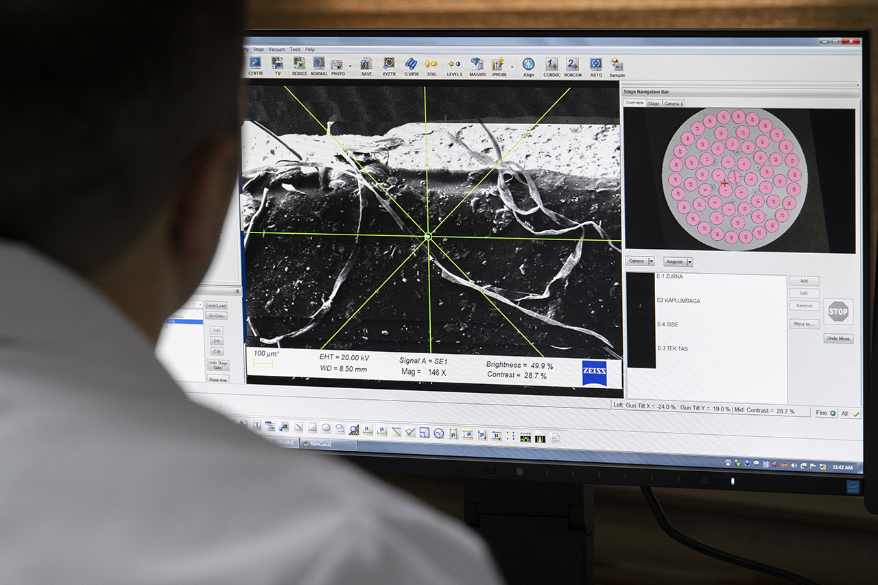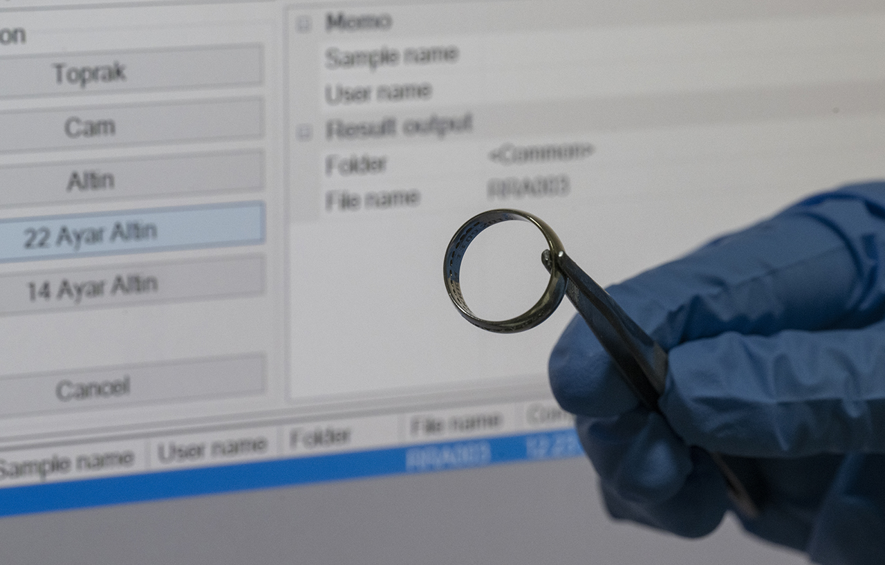 Metal analizi başlığı altında, soruşturmacı birimlerce altın ya da sahte altın şüphesiyle gelen bulgular da olabileceğini belirten Kalkan, metal analizi çalışmalarına yönelik şu bilgileri verdi: "Örneğin, bir kişi bir bilezik aldı, bunun sahte olduğundan şüphelenerek karakola gidip bir şikayette bulunuyor. Bu bileziğin içerisindeki altın oranını tespit etmek işte bizim görevimiz. Bu altın oranını tespit ederek soruşturmacı birime raporluyoruz. 22 ayar, 14 ayar veya 24 ayarda olması gereken altın miktarı vardır. Bu şekilde, bunu tespit ediyoruz."