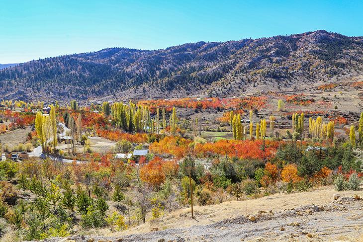 Sonbaharla birlikte sarı, kırmızı ve kahverenginin tonlarının ağırlık kazandığı ilçedeki yüksek rakımlı kiraz bahçeleri manzarasıyla dikkati çekiyor.