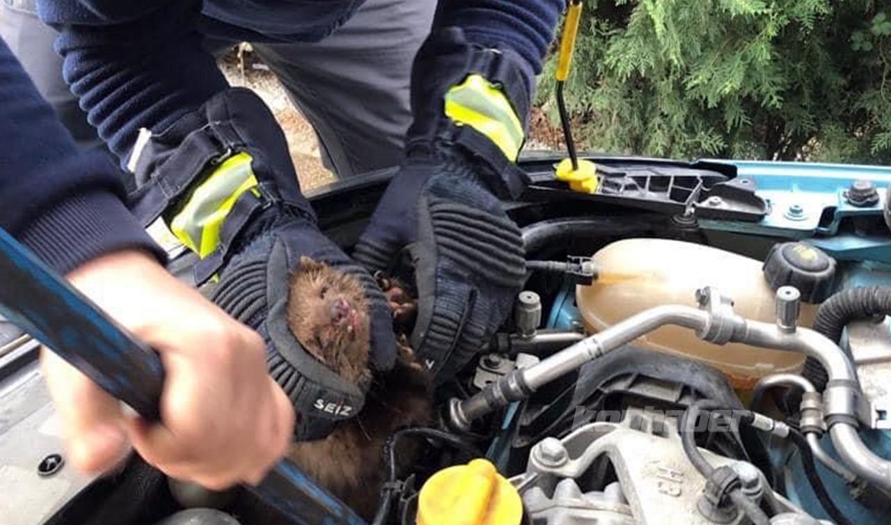 Ada Mahallesi'nde aracından ses geldiğini duyunca kaputunu açan sürücü, motor kısmında bir hayvan bulunduğunu gördü.