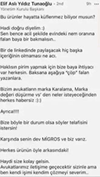 “Bu ürünler hayatta küflenmez biliyor musun? Hadi doğru diyelim. Sen bence acil şekilde evindeki nem oranına falan baya bir bakmalısın. Bir de Linkedin’de paylaşacak hiç başka içeriğinin olmaması ne acı. Haklısın pirim yapmak için bize baya ihtiyacı var herkesin. Baksana aşağıya ‘çöp’ falan yazanlara. Bizim avukatların marka Karalama, Marka değeri düşürme vs' den neler isteyeceğinden herkes habersiz. Ayrıca! Bize böyle bir durum olsa söyler telafisini istersin! Karşında senin dev MİGROS ve biz varız. Herkes ürünün öyle arkasındaki! Haydi size kolay gelsin. Avukatlarımız iletişime geçecektir sizinle ama ben kendi işimi kendim çözmeyi severim."