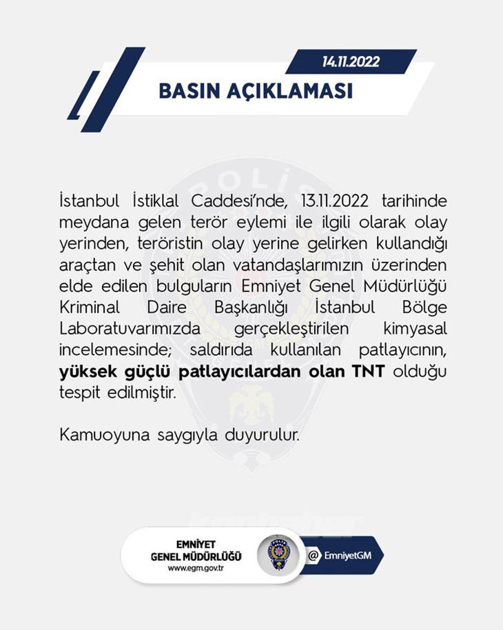 "İstanbul İstiklal Caddesi'nde, 13 Kasım 2022 tarihinde meydana gelen terör eylemi ile ilgili olarak olay yerinden, teröristin olay yerine gelirken kullandığı araçtan ve şehit olan vatandaşlarımızın üzerinden elde edilen bulguların Emniyet Genel Müdürlüğü Kriminal Daire Başkanlığı İstanbul Bölge Laboratuvarı'mızda gerçekleştirilen kimyasal incelemesinde; saldırıda kullanılan patlayıcının, yüksek güçlü patlayıcılardan olan TNT olduğu tespit edilmiştir."