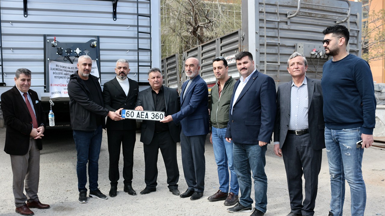 Büsan Organize Sanayi'nde düzenlenen törende dorse, memleketleri Tokat'tan tıra yükledikleri yardım malzemelerini bölgeye ulaştıran Murat Kaan Erdem'e teslim edildi.