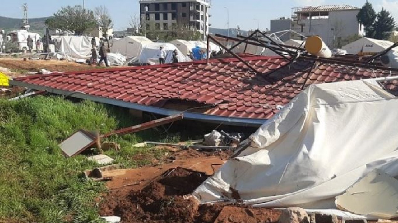 Deprem nedeniyle kurulan bazı çadır ve konteynerlerin de etkilendiği hortumda ilçedeki bazı araçların da ters döndüğü görüldü.