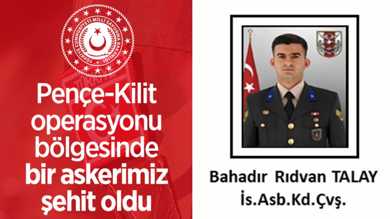Milli Savunma Bakanlığı, Pençe-Kilit operasyonu bölgesinde, bölücü terör örgütü mensuplarının yerleştirdiği el yapımı patlayıcı maddenin (EYP) patlaması sonucunda İstihkam Astsubay Kıdemli Çavuş Bahadır Rıdvan Talay’ın şehit olduğunu açıkladı.