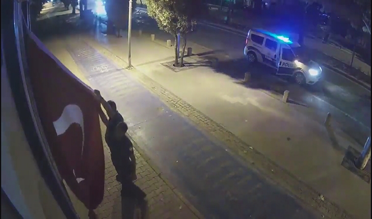 Bayrağı yerine bağlamaya çalışan polis memurları bunda başarılı olamayınca ekip aracını şehitlik kapısına yanaştırdı. Polis memurlarından Solmaz, aracın üzerine çıkarak Türk bayrağını yeniden yerine bağladı.