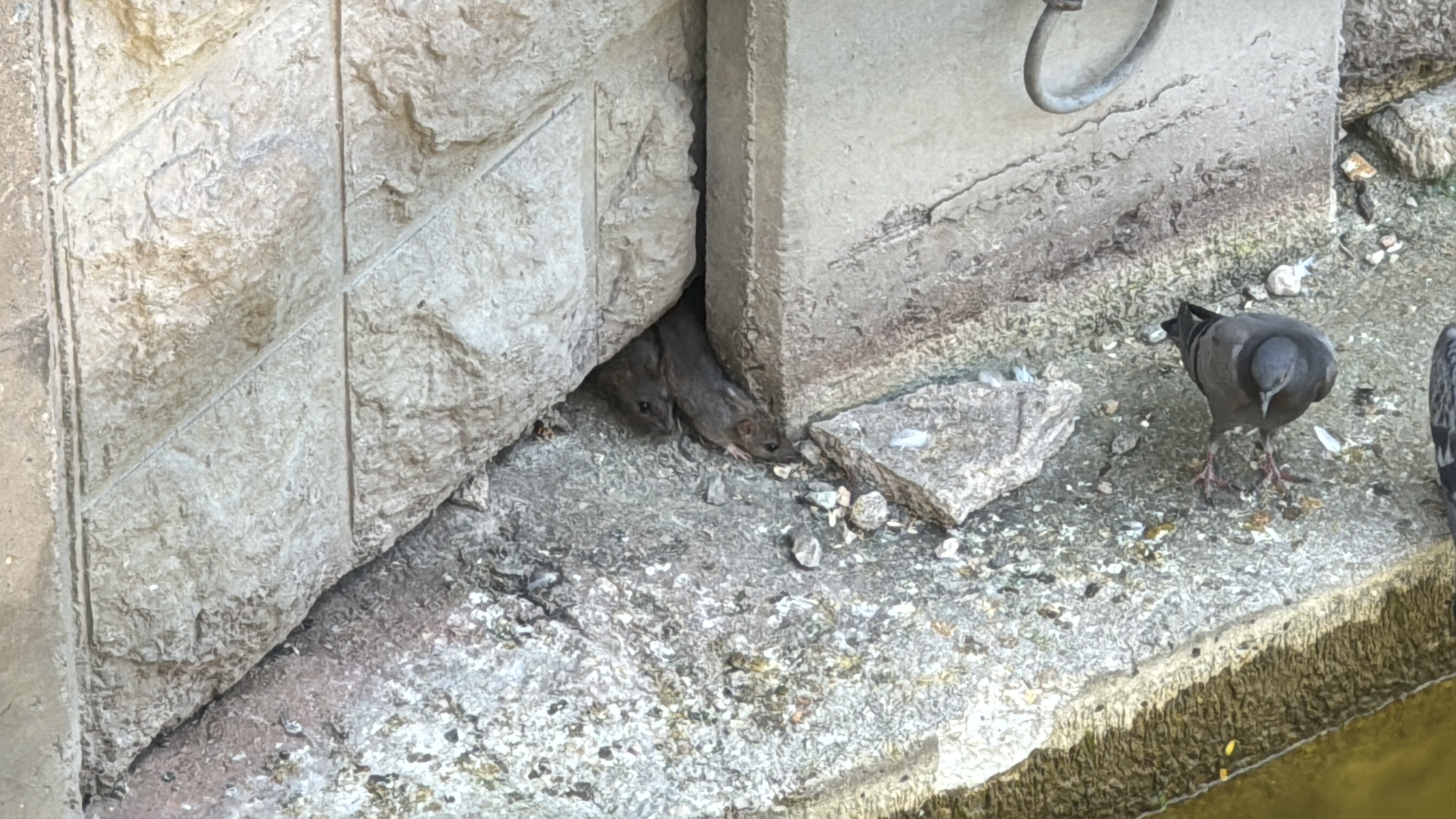 Su kenarında güvercinler için atılan ekmek kırıntıları ve buğdayla beslenen fareler, duvardaki boşluğun içine saklanıyor.