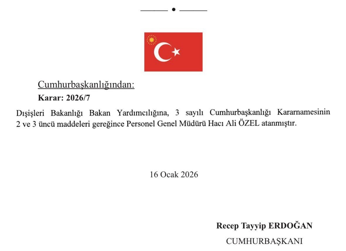Bazı bakanlıklara ilişkin atama ve görevden alma kararları Resmi Gazete'de yayımlandı. Resmi Gazete'de yayımlanan atama kararlarına göre Dışişleri Bakanlığı Bakan Yardımcılığına Hacı Ali Özel atandı.