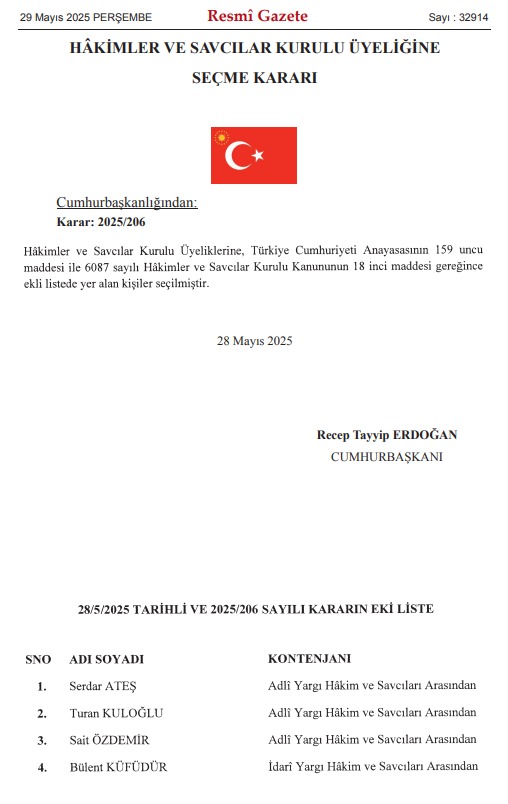 Cumhurbaşkanı Recep Tayyip Erdoğan'ın imzasıyla yayımlanan Resmi Gazete'de Hakimler ve Savcılar Kuruluna (HSK) 4 yeni üye atandı.