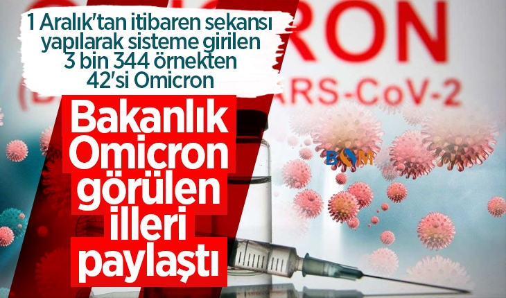 Sağlık Bakanlığı, 1 Aralık'tan itibaren sekansı yapılarak sisteme girilen 3 bin 344 örnekten 42'sinin Omicron varyantı olduğunu açıkladı. İstanbul'da 30, İzmir'de 6, Şırnak'ta 1, Diyarbakır'da 1, Kütahya'da 2, Isparta'da 2 Omicron vakası görüldü.