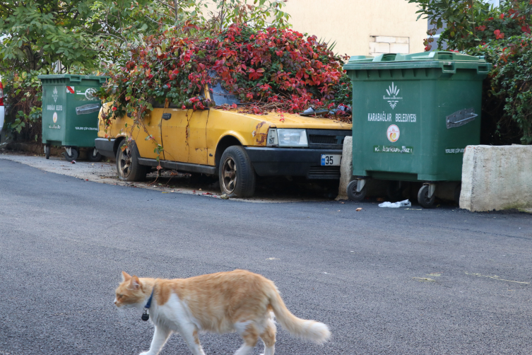 İzmir Karabağlar'da bir otomobil, tam 8 yıldır aynı yerde duruyor. Sahibi vefat edince kaderine terk edilen araç, zamanla sarmaşıklarla kaplanarak adeta sokağa 'kök saldı'. Mahalleli ise hem görüntüden hem de yapılamayan asfalt çalışmasından şikayetçi.