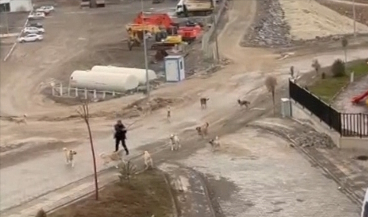 Kısa sürede köpeklerin etrafını sardığı kişi, yol kenarında gördüğü sopayı alarak kendini korumaya çalıştı.
