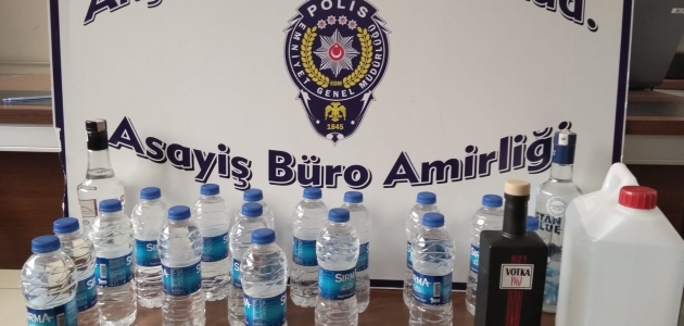 Evde, yarımşar litrelik 16 su şişesi, muhtelif markalarda 3 şişe ve 5 litrelik bidon içerisinde farklı türlerde kaçak içki ele geçirildi.