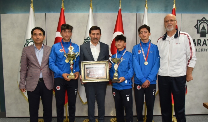 Turnuvada kazandıkları kupayla birlikte Karatay Belediyesi’ne gelen ve Başkan Hasan Kılca ile bir süre görüşen şampiyon takımın sporcu ve okul yöneticileri, turnuvaya katılımları ile bugüne kadarki destekleri dolayasıyla Karatay Belediye Başkanı Hasan Kılca’ya teşekkür ettiler.