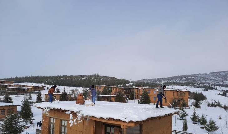Konya'nın Hüyük ilçesindeki sanatçılara ait kerpiç evlerin bulunduğu Sonsuz Şükran Köyü'nde toprak damlarda biriken karları temizleme çalışması devam ediyor.