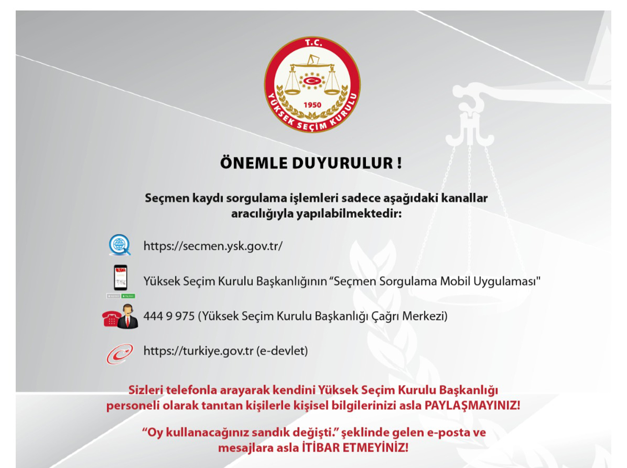 YSK ise resmi internet sitesinden yaptığı paylaşımda, kullanıcıların bir mağduriyet yaşaması adına yazılı uyarıda bulundu. Uyarıda, "Sizleri telefonla arayarak kendini Yüksek Seçim Kurulu Başkanlığı personeli olarak tanıtan kişilerle bilgilerinizi asla paylaşmayınız. 'Oy kullanacağınız sandık değişti.' şeklinde gelen e-posta ve mesajlara asla itibar etmeyiniz!" ifadelerine yer verildi.