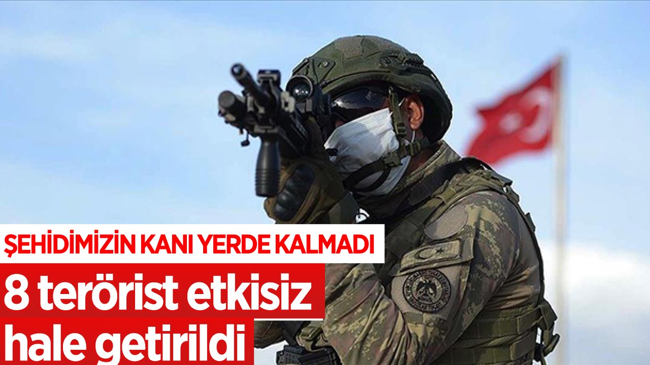 Pençe-Kilit Operasyonu bölgesinde teröristlerle çıkan çatışmada 1 askerimiz şehit oldu. Mehmetçik saldırıya güçlü şekilde karşılık verdi. Dün 6 terörist bugün de 2 teröristin etkisiz hale getirilmesiyle toplam sayı 8'e yükseldi.