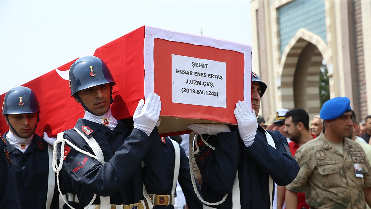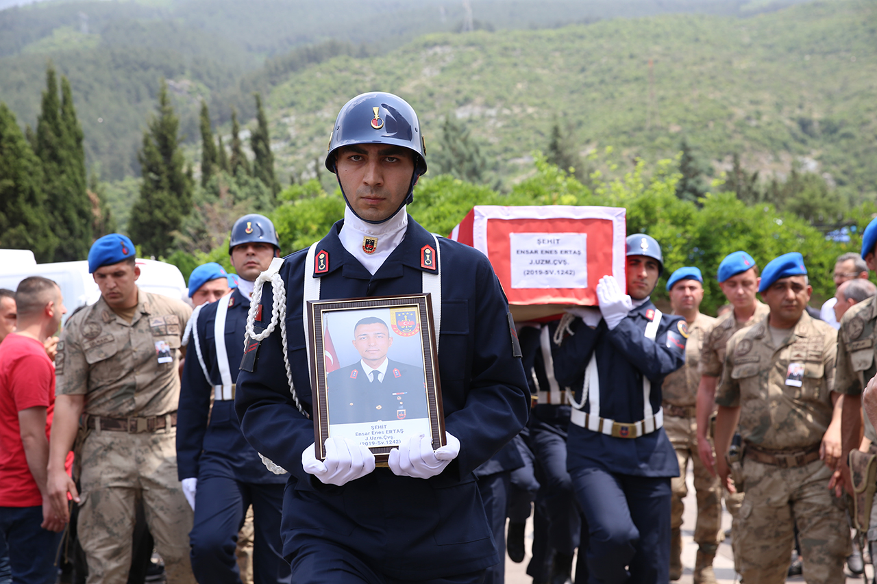 Namaz sonrası Ertaş'ın naaşı, mezarlıktaki şehitlikte toprağa verildi. Şırnak'ta Gabar Dağı Pire Tepe mevkisinde dün askeri aracın kontrolden çıkarak devrilmesi sonucu Jandarma Uzman Çavuş Ensar Enes Ertaş ve Jandarma Astsubay Çavuş Mustafa Şen şehit olmuş, 2 asker yaralanmıştı.