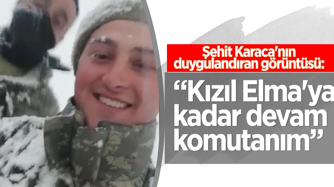 Irak'ın kuzeyinde şehit olan Piyade Sözleşmeli Er Yasin Karaca'nın (23), silah arkadaşları ile çektiği görüntüler ortaya çıktı. Karaca'nın karlar altında çektiği görüntülerde, "Kızıl Elma'ya kadar devam komutanım" dediği görüldü.