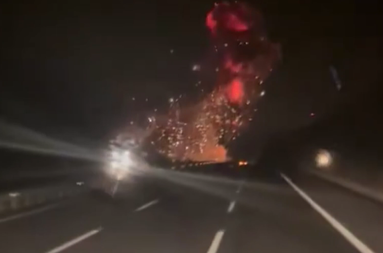 Görüntülerde, otoyolda ilerleyen araçtaki vatandaşların gökyüzündeki patlamayı fark ederek büyük şaşkınlık yaşadığı görülüyor.