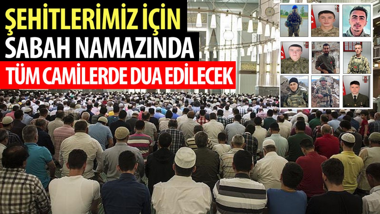 Diyanet İşleri Başkanı Ali Erbaş, yarın sabah namazında tüm camilerde terör örgütlerine karşı yapılan operasyonlarda şehadete kavuşan Mehmetçikler ve tüm şehitler için dua edileceğini duyurdu.