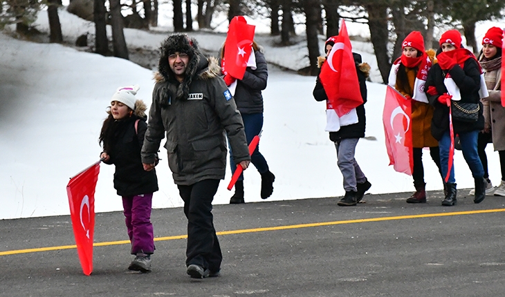 Kars merkez ve Sarıkamış ilçesinden, otobüslerle zirveye ulaşan vatandaşlar, ellerinde Türk bayraklarıyla yürüyerek toplanma alanına geldi.