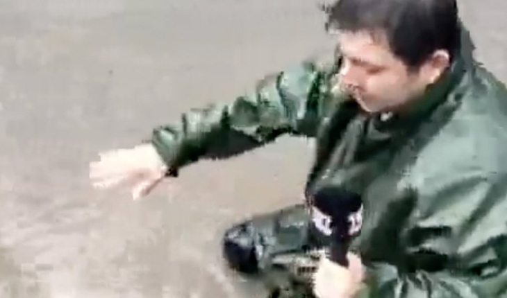 Sıcak gelişmeleri anlık olarak aktarmaya çalışan muhabir, bölgedeki yoğun su birikintisinin bulunduğu rögara düştü.