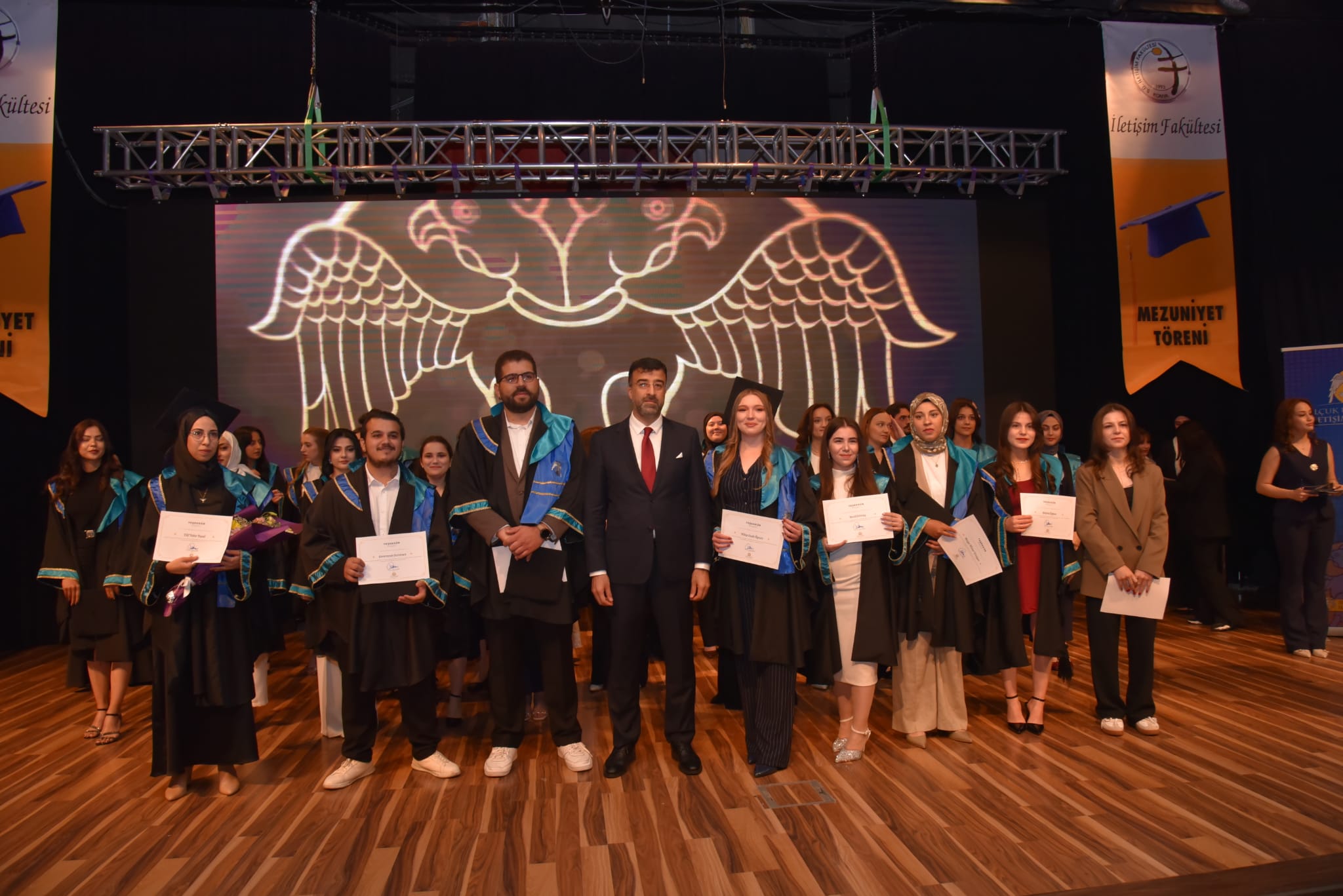 Öğrencilerin çabasının ve emeğinin fakülteye iz bıraktığını belirten Çakır, şunları kaydetti:"Bugün burada uzun bir yolculuğun son durağında ama aynı zamanda yeni bir başlangıcın eşiğinde bir aradayız. Yıllar boyunca birlikte yürüdüğümüz yollar artık başka yönlere ayrılacak. Birlikte yazdığımız hikayenin en özel sayfalarından birisi, iletişim her şeyin başı. Belki de insan olmanın özü. Duygularımızı, düşüncelerimizi, hayallerimizi anlatmanın, anlaşılmanın yolu. Sizler bu fakültede sadece meslek öğrenmediniz, aynı zamanda toplumla nasıl bağ kuracağınızı, insanlara nasıl dokunacağınızı, sözcüklerin, görüntülerin ve fikirlerin gücünü öğrendiniz. Halkla ilişkilerde güveni inşa etmenin, gazetecilikte gerçeğin peşinde koşmanın, sinemada hayata farklı gözlerle bakmanın, reklamcılıkta yaratıcılığı stratejiyle birleştirmenin ne demek olduğunu yaşayarak deneyimlediniz."