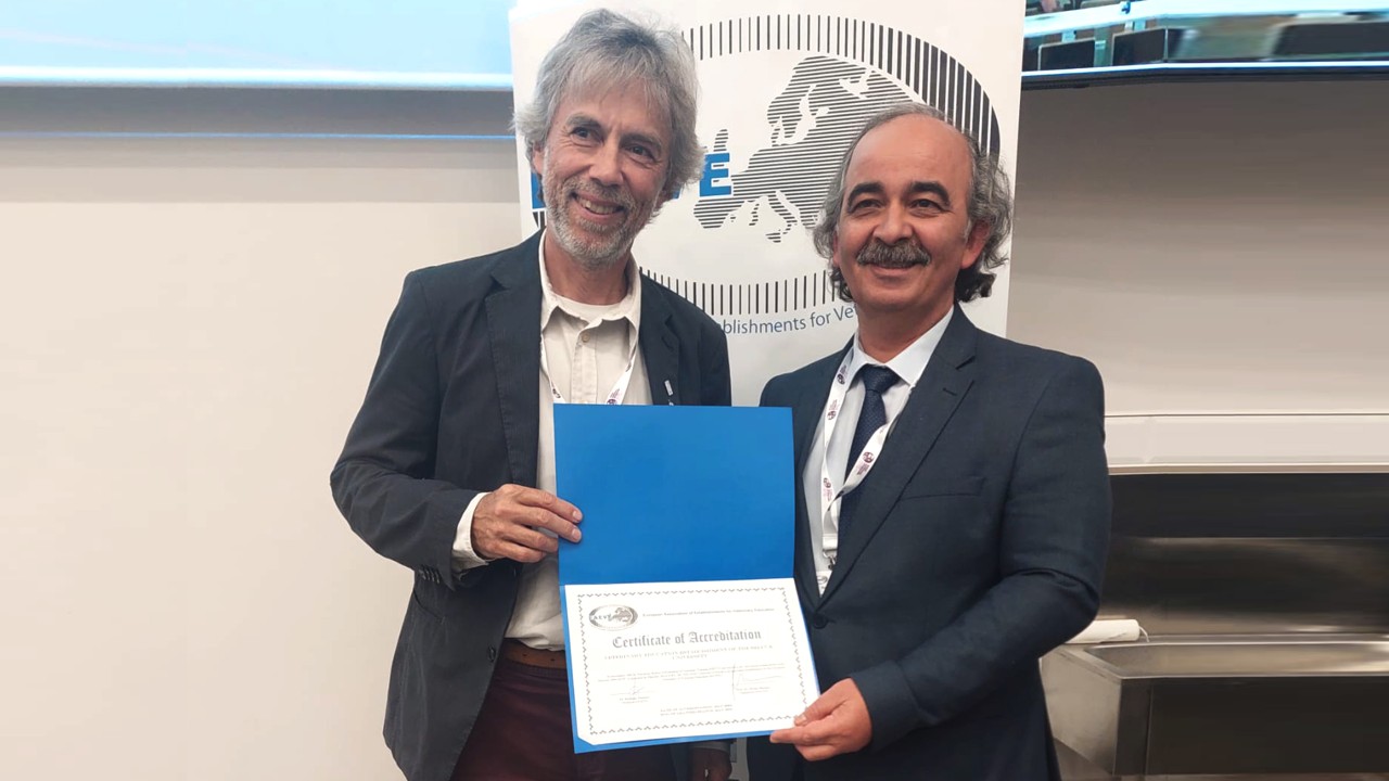 Akreditasyon Belgesi, Paris’te gerçekleştirilen EAEVE Genel Kurulunda düzenlenen törenle Selçuk Üniversitesi Veteriner Fakültesi Dekanı Prof. Dr. Seyfullah Haliloğlu’na takdim edildi. (Yunus Köroğlu)