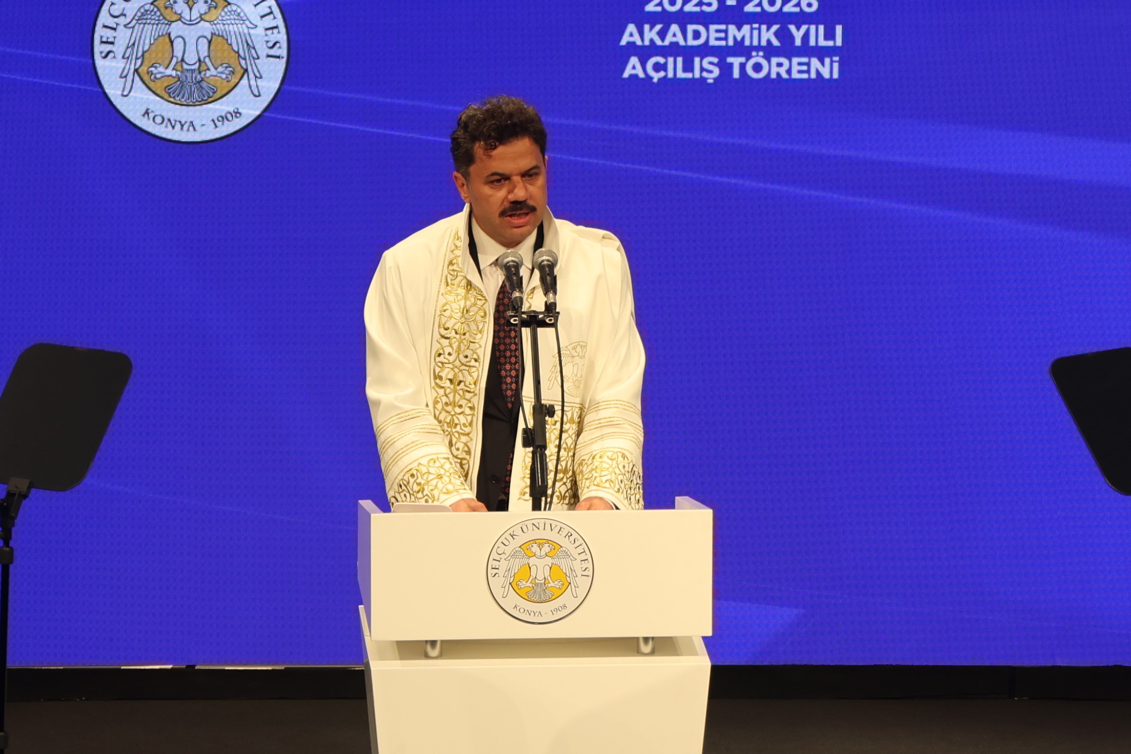 Akademik yıl açılış töreni, Sultan Alparslan Kültür Merkezi 30 Ağustos Salonuna gerçekleştirildi. Törende açılış konuşmasını Selçuk Üniversitesi Rektörü Prof. Dr. Hüseyin Yılmaz yaptı. Rektör Yılmaz, göreve geldikleri günden itibaren üniversiteyi yalnızca bilgi üreten değil, ürettiği bilgiyi topluma aktaran bir yapıya kavuşturmak için çalıştıklarını belirterek, "Bu anlayışla araştırma kapasitemizi güçlendirdik, akademik üretkenliği teşvik ettik. Ulusal ve uluslararası sıralamalarda yükseldik, tam akreditasyon sürecimizi başarıyla tamamladık. Çok sayıda bilimsel proje ve yayınla marka değerimizi güçlendirdik. Dijital dönüşüm kapsamında önemli mesafeler kat ettik" dedi.
