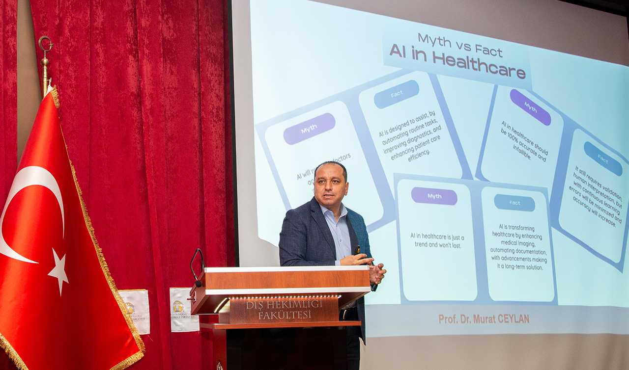 Selçuk Üniversitesi Araştırma Dekanlığı tarafından düzenlenen sağlıkta yapay zeka konferans serisi Diş Hekimliği Fakültesinde başladı. Uzmanlar, sağlık alanında yapay zekanın sunduğu fırsatlar ve geleceğe etkilerini akademisyen ve öğrencilere anlattı.