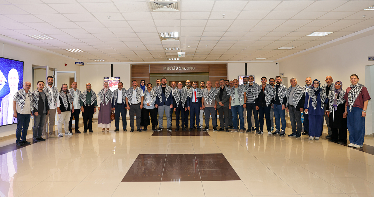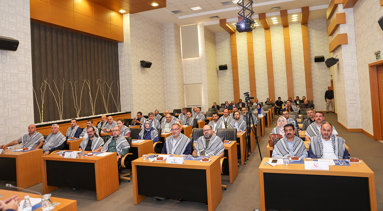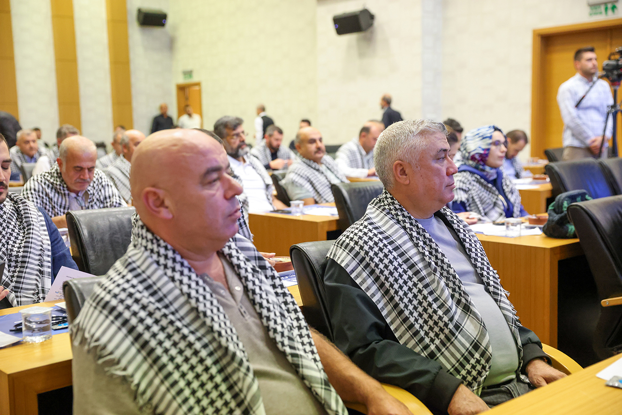 Başkan Pekyatırmacı ve Selçuklu Belediyesi Meclis Üyeleri toplantıya omuzlarında Filistin Kefiyesi ile katıldı.