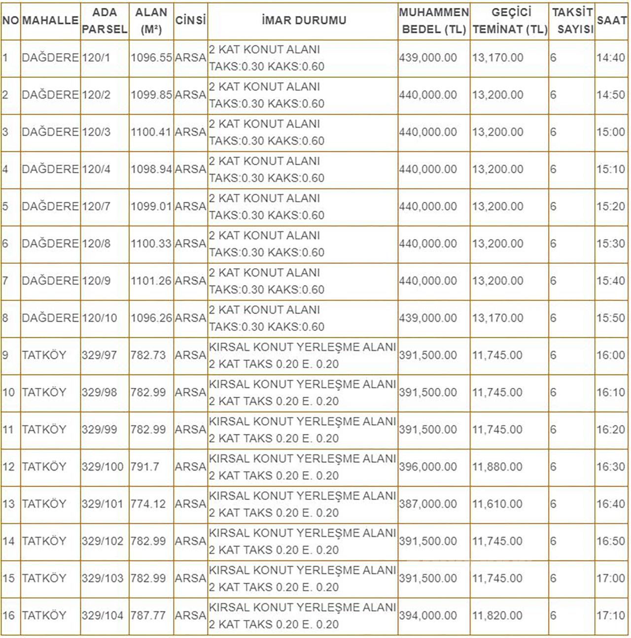 Dağdere ve Tatköy Mahallelerinde satışa sunulacak arsalar için ihaleye katılacaklardan istenen belgeler;