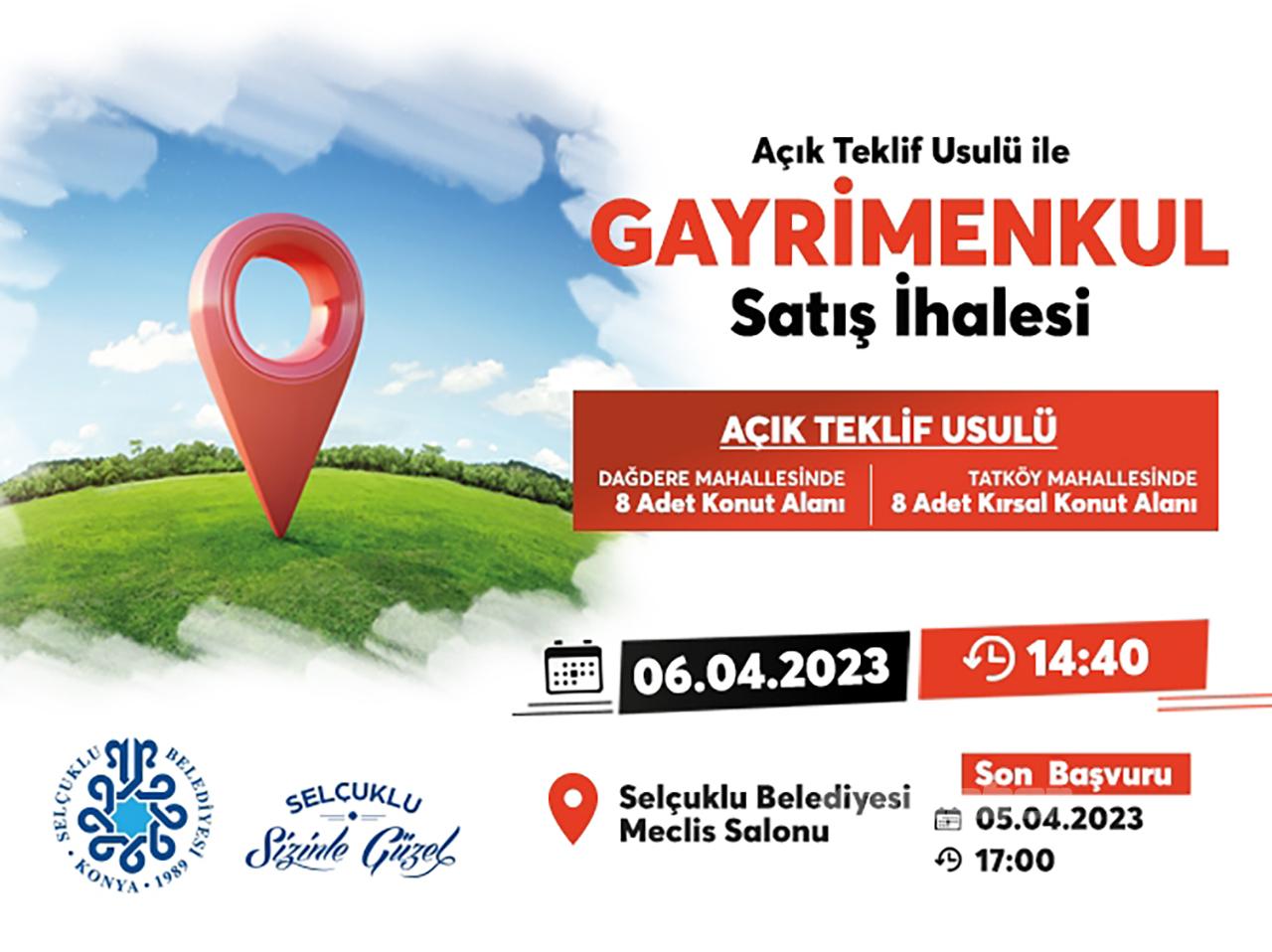 İhale tarihi 06/04/2023 perşembe günü listede belirtilen saatte Selçuklu Belediyesi Meclis Salonunda yapılacak. İhaleye katılacak kişilerin ihale evraklarını en geç 05/04/2023 günü saat 17.00’ye kadar Emlak ve İstimlak Müdürlüğüne teslim etmeleri gerekiyor. Belirtilen saatten sonra yapılan müracaatlar kabul edilmeyecek. Ayrıca, şartname ve ekleri Belediye Emlak ve İstimlâk Müdürlüğünde ücretsiz olarak görülebiliyor.