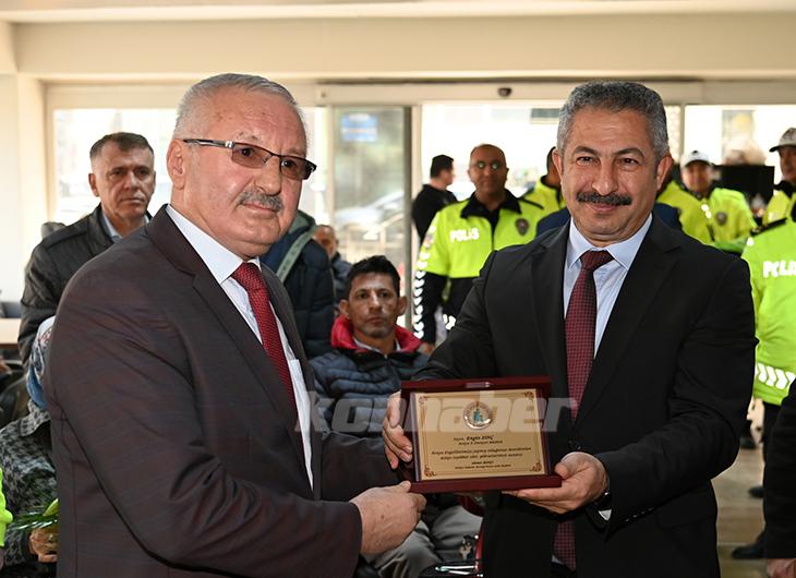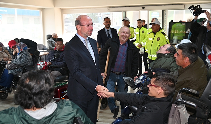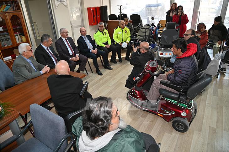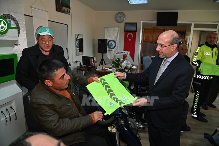 Konya İl Emniyet Müdürü Engin Dinç ve Selçuklu Belediye Başkanı Ahmet Pekyatırmacı ziyarette engellilere reflektörlü çanta dağıttı.