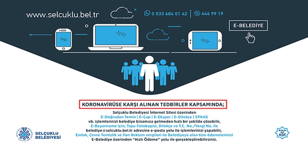 Selçuklu Belediyesi koronavirüs önlemleri kapsamında vatandaşların e-belediye hizmetlerini kullanmaları, talep ve şikayetleri ise 444 99 19 numaralı telefon hattına yapmaları yönünde çağrıda bulundu.