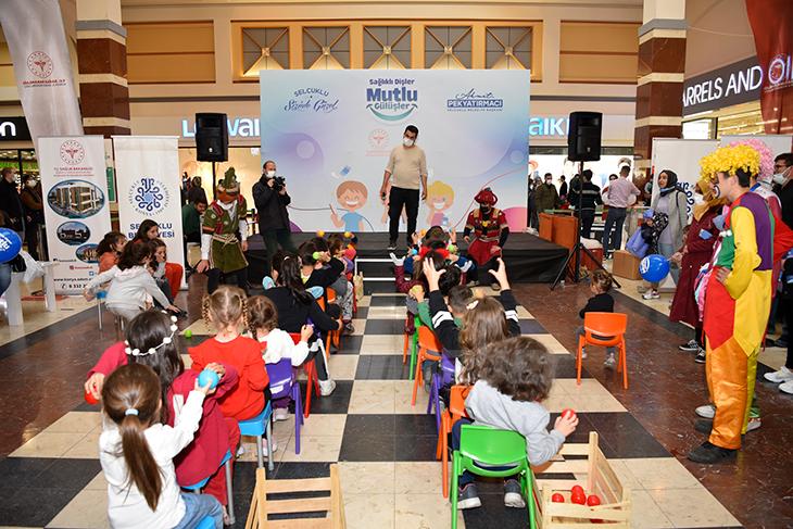 Programda ağız ve diş sağlığının önemini anlatan çeşitli aktiviteler yapılırken çocuklara diş fırçası, diş macunu ve diş fırçalama süresine dikkat çekmek için kum saatinin olduğu mini kutular dağıtıldı. Palyaçolar ve diş maskotu eşliğinde oynadıkları oyunlarla keyifli dakikalar geçiren çocuklar düzenlenen yarışmalarla unutulmaz anlar yaşadı.