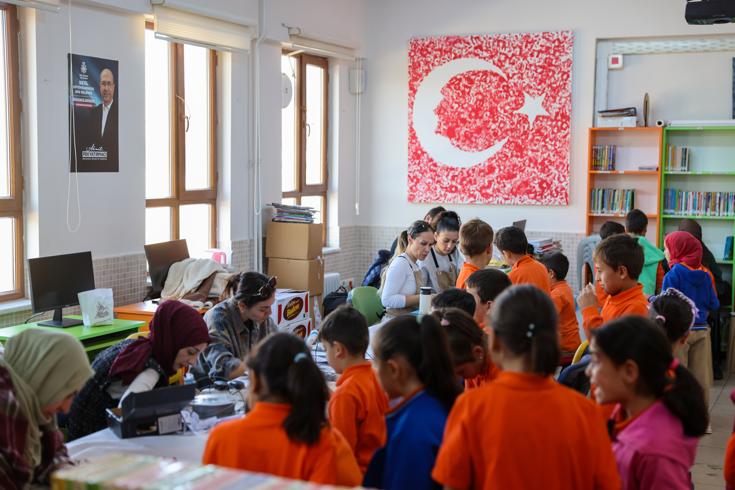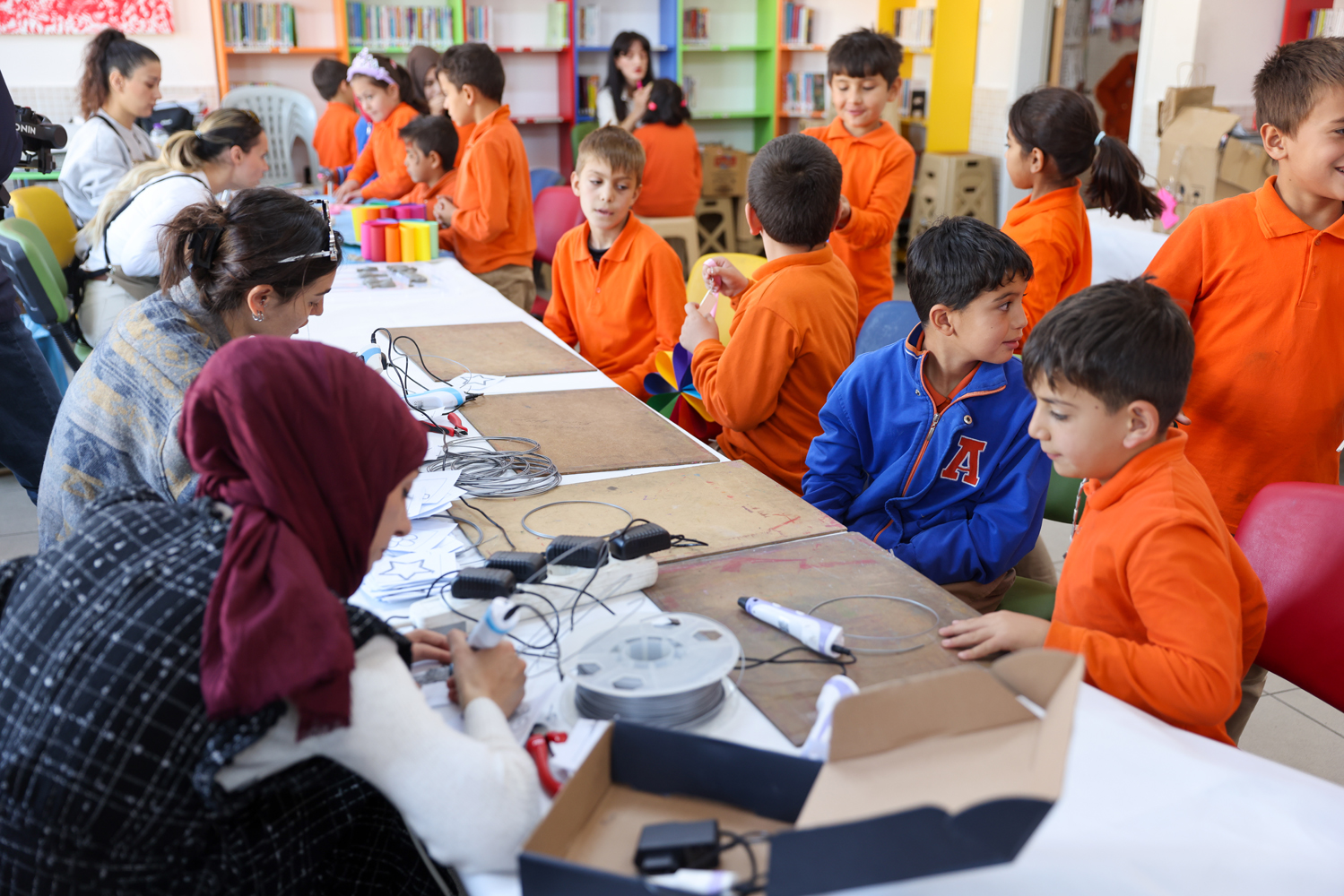 Okul bahçesine kurulan etkinlik alanında öğrenciler, eğitmenler eşliğinde çeşitli sanatsal ve el becerisine yönelik çalışmalara katıldı.