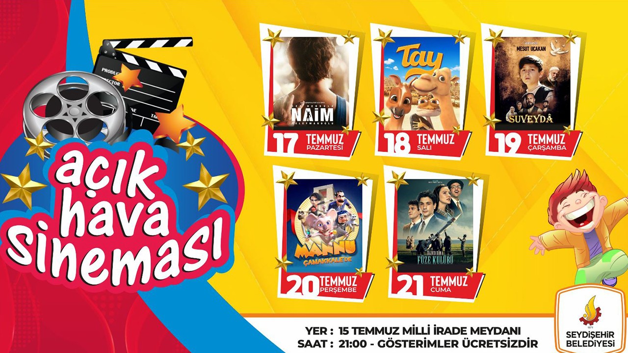 Başkan Tutal, “Kültürel ve sosyal etkinliklerde öncü ilçe olan Seydişehir’imizde kültürel etkinliklerimize hız kesmeden devam ediyoruz. 17 Temmuz’da başlayacak olan ve 5 gün devam edecek birbirinden değerli filmleri açık hava sinemasıyla ilçe sakinlerimizle buluşturuyoruz. 17 Temmuz Pazartesi günü Cep Herkülünaim Süleymanoğlu filmiyle birlikte başlayacak olan etkinliğimizde Salı günü TAY, Çarşamba günü Suveyda, Perşembe günü Mannu Çanakkale’de ve son olarak Cuma günü ise Bandırma Füze Kulübü filmlerinin gösterimi yapılacak. Gösterimlerimiz ücretsiz olup tüm hemşehrilerimizi düzenleyeceğimiz açık hava sineması etkinliğimize davet ediyorum” diye konuştu. (Tahir Yılmaz)