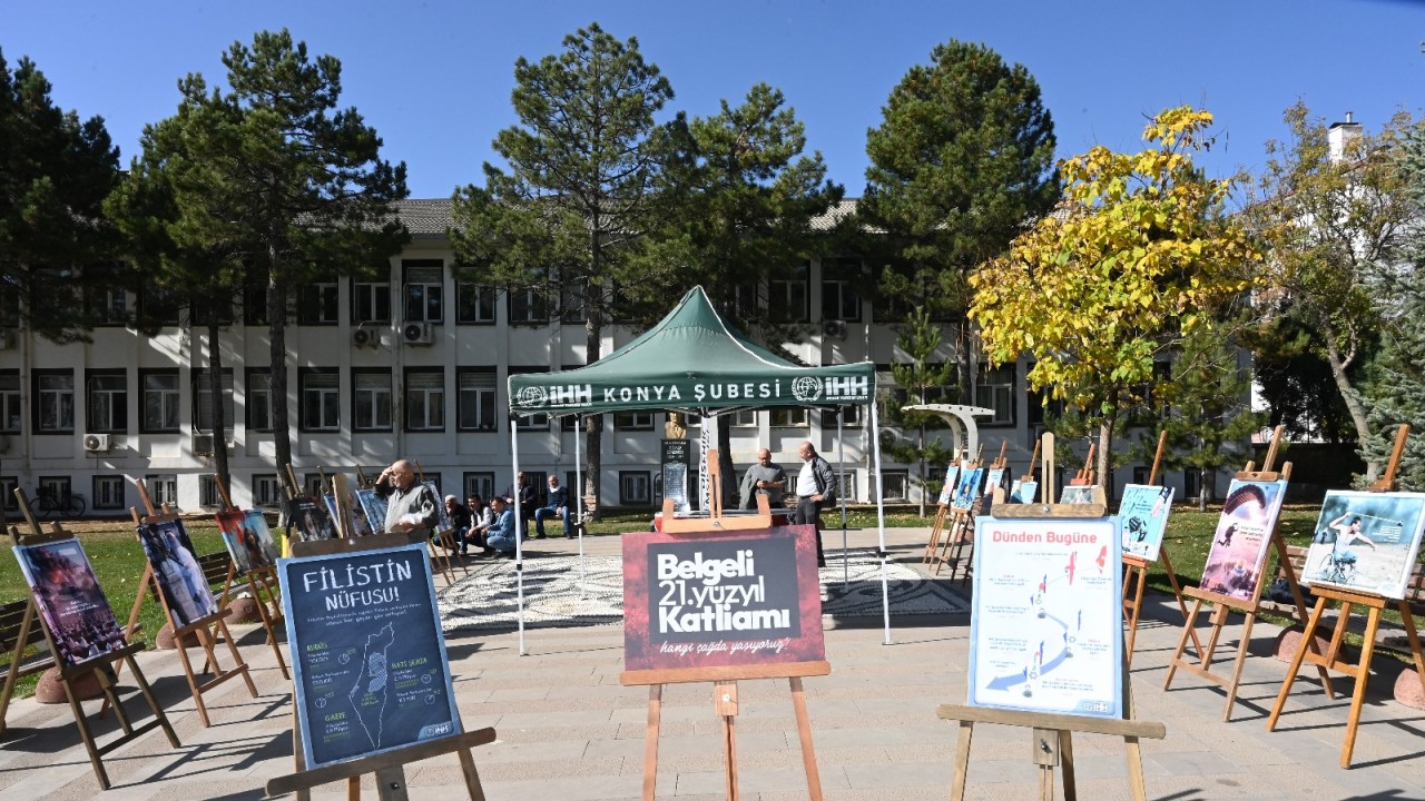 İnsani Yardım Vakfı (İHH) Derneği Seydişehir Temsilciliği'nce Hükümet Konağı önünde açılan fotoğraf sergisinde, İsrail'in Gazze'deki saldırıları ve bölgede çekilen kareler yer alıyor.