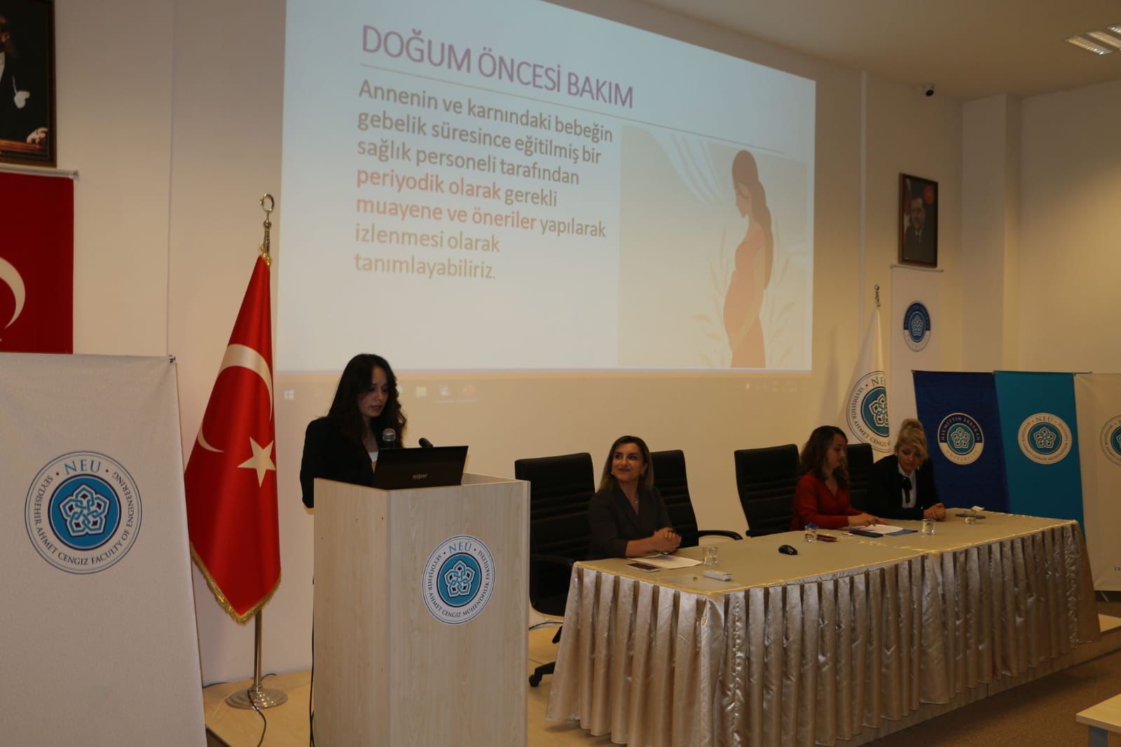 Ahmet Cengiz Mühendislik Fakültesi Konferans Salonu'ndaki seminerde, İlçe Sağlık Müdürlüğü tarafından gebelikle ilgili sunumlar yapıldı.