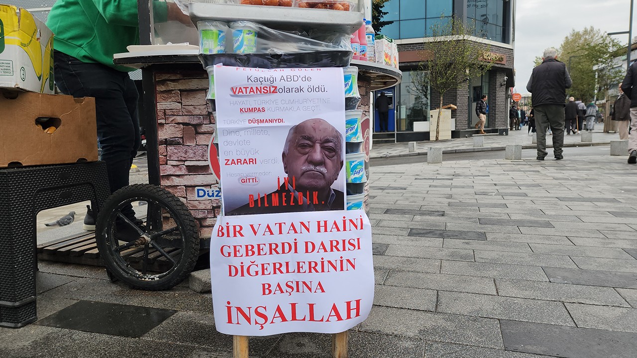 FETÖ elebaşı Fetullah Gülen’in ölümünün ardından Düzce şehir merkezinde seyyar simitçilik yapan Ercan Biltaş isimli esnaf, simit tezgahına ‘Kaçtığı ABD’de vatansız olarak öldü. Hayatı Türkiye Cumhuriyeti’ne kumpas kurmakla geçti. Türkiye düşmanıydı. Dine, millete, devlete en büyük zararı verdi. Hesap vermeden gitti. İyi bilmezdik. Bir vatan haini geberdi. Darısı diğerlerinin başına inşallah” yazısı astı.