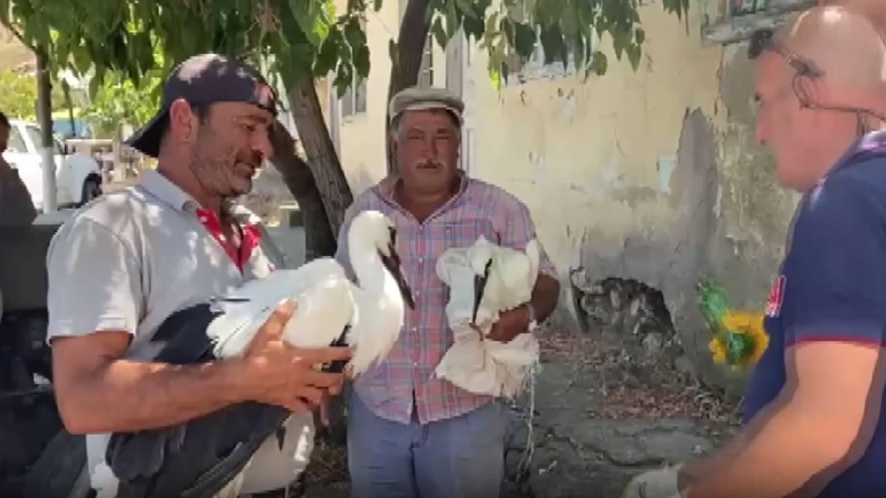 Sıcak havada uzun süredir aç ve susuz kalarak bitkin düştükleri belirlenen leylekler, yuvadan indirildikten sonra ekiplerce beslendi.Leylekler, daha sonra başka bir yuvaya konuldu.