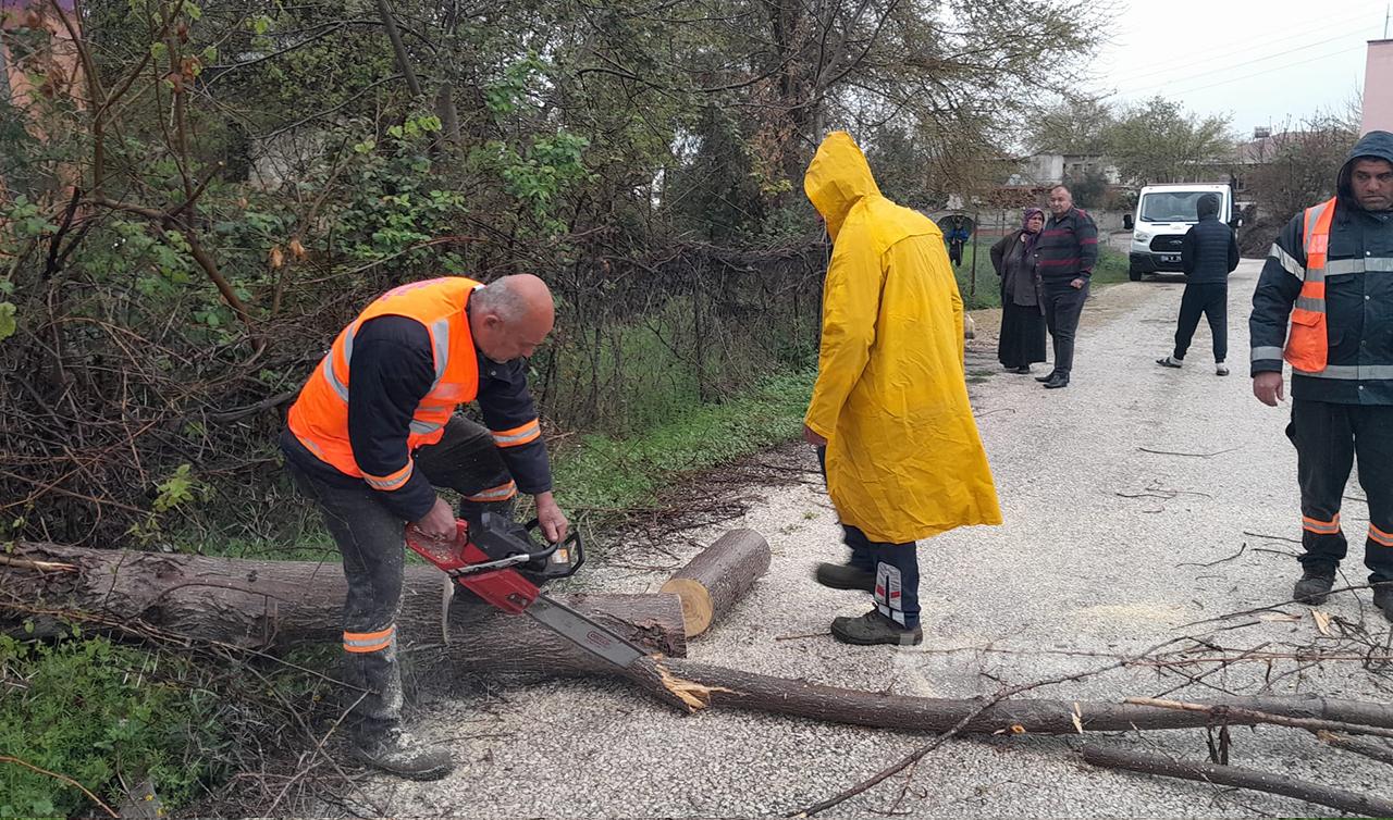 Belediye ekiplerinin devrilen ağacı kaldırmasının ardından elektrik şirketi görevlileri, sokaktaki kesintiyi gidermek için çalışma başlattı.