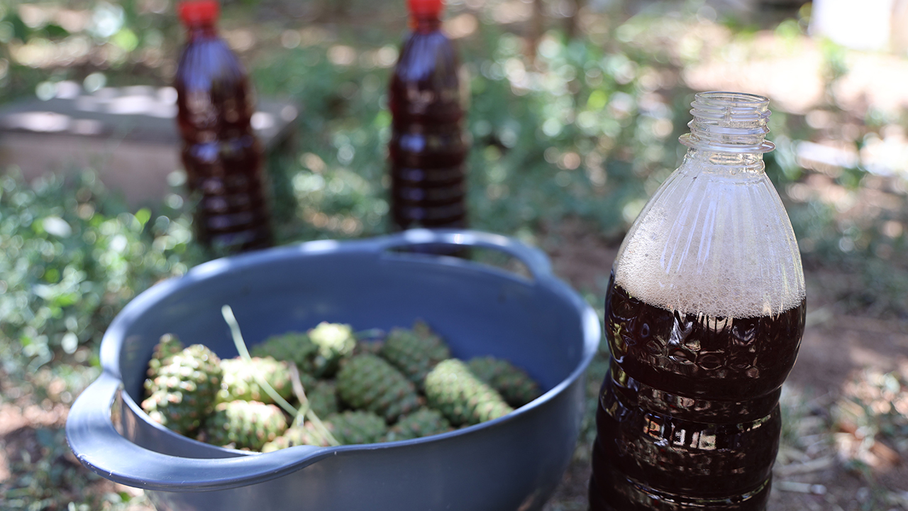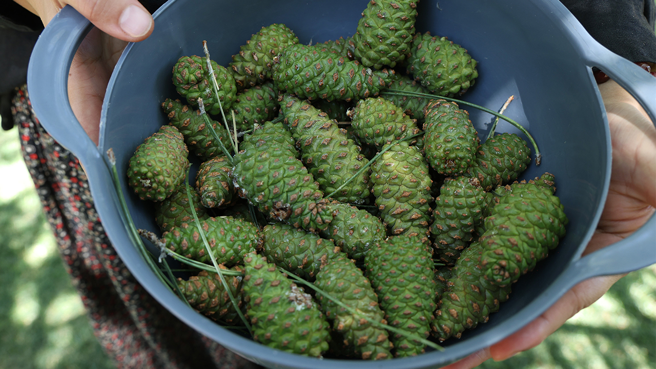 Bebek kozalaklarımızı topluyoruz. Bir gün boyunca suda bekletiyoruz. Beklettikten sonra odun ateşinde kazanda tam 7 saat bunu kaynatıyoruz. Şeker kullanmıyorum. Eğer şekerli isteyenler olursa içerisinde esmer şeker veya doğal bal var.