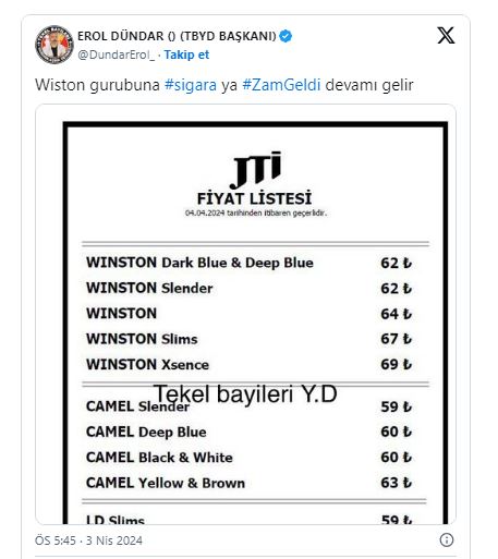 Tekel Bayileri Yardımlaşma Derneği (TBYD) Başkanı Erol Dündar bir sigara grubuna 8 TL'lik zam geldiğini duyurdu. İşte yeni zamlı liste...