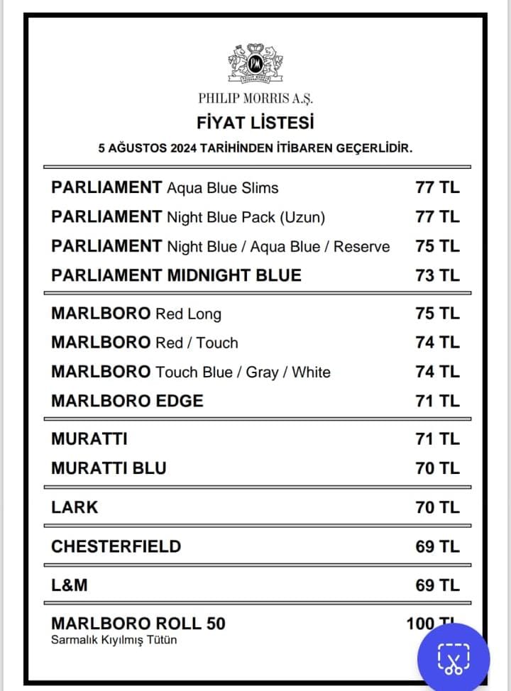 Dündar'ın duyurusuna göre sigara fiyatlarına paket başı 5 TL zam geldi. Böylelikle sigara grubunun en pahalı sigarası 77 TL; en ucuzu ise 69 lira oldu.