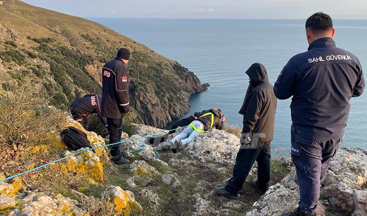 Sinop'ta deniz kenarında uçurumda bulunan kadın cesedi, ekiplerin çalışmasıyla çıkartılarak morga kaldırıldı.