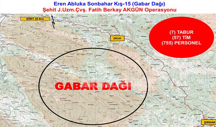 İçişleri Bakanlığınca, Şırnak ve Siirt’te 755 personelin katılımıyla Eren Abluka Sonbahar-Kış-15 (Gabar Dağı) Şehit Jandarma Uzman Çavuş Fatih Berkay Akgün Operasyonu başlatıldığı bildirildi.