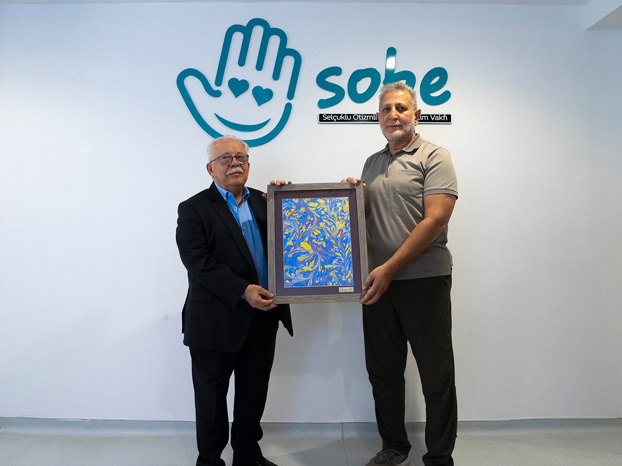 Törenin sonunda SOBE Vakfı Başkanı Mustafa Ak, Mehmet Ali Atiker’e otizmli bir öğrencinin hazırladığı ebru tablosunu hediye etti.